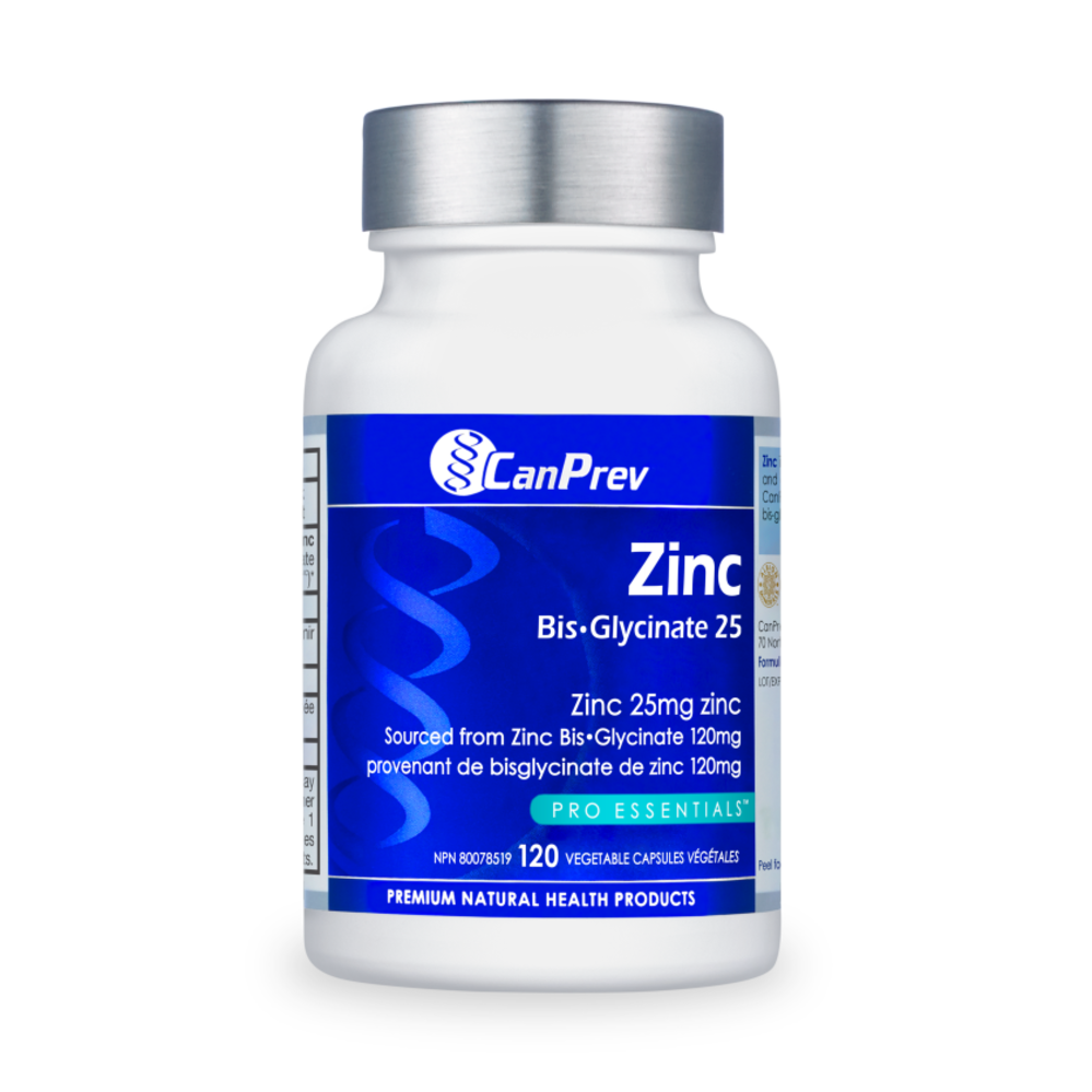 CanPrev’s Zinc Bis-Glycinate 25 is the preferred form of zinc due to its superior absorption and gentleness. Daily intake is important, as we excrete what we don’t use or absorb. The mineral zinc plays an important role in several bodily functions including proper wound healing, taste, vision, cognitive health, immunity, blood sugar support, and normal glandular function. It’s also an essential component of the body’s antioxidant enzymes, superoxide dismutase (SOD) and glutathione peroxidase.