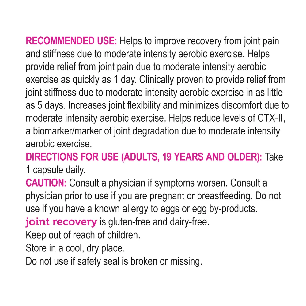 Loving your workouts lately, but hate the joint pain that comes with them? joint recovery is here to help you manage, reduce and prevent exercise-related joint pain and stiffness with lasting results. Our formula contains only 1 ingredient - 500mg of NEM® (upcycled and all-natural eggshell membrane). This well-studied ingredient will help protect the cartilage between your joints, cushioning them from the impact of exercise so you can start experiencing less pain. It's the most effective and easy way to bounce back to your active lifestyle!