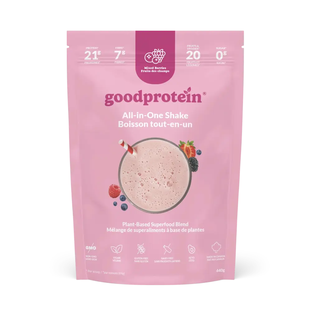 Protein blend (pea protein, milled golden flaxseed), natural flavours, soluble tapioca fibers, coconut milk powder* (coconut milk powder*, tapioca maltodextrin*, acacia gum*), acacia gum, guar gum, xanthan gum, medium chain triglycerides (medium chain triglycerides from coconut oil, acacia gum), fruits, vegetables, and mushrooms blend (blueberry juice powder*, broccoli, spinach, kale, pumpkin, sweet potato, sunflower seed, cranberry, chlorella, maitake mushroom, shiitake mushroom, pomegranate juice powder*, acai juice powder*, goji juice powder*, grape juice powder*, amla fruit powder*, aronia powder*, sea buckthorn juice powder*, camu camu powder*, acerola juice powder*), rebaudioside M, citric acid, salt, beetroot colour, and bacterial culture and enzymes blend (rice maltodextrin, Bacillus subtilis, amylase, protease). *Organic ingredients.