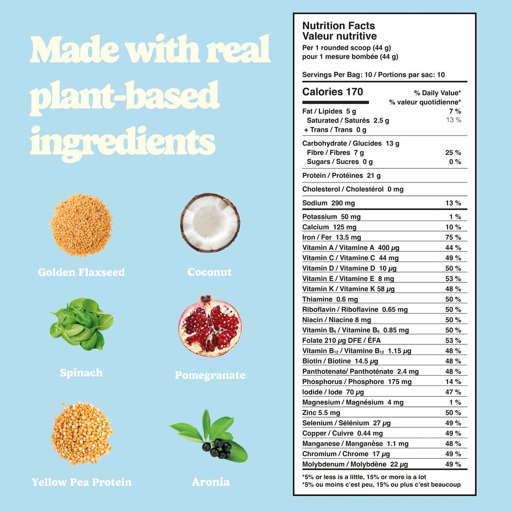 Protein blend (pea protein, milled golden flaxseed), natural flavours, soluble tapioca fibers, coconut milk powder* (coconut milk powder*, tapioca maltodextrin*, acacia gum*), acacia gum, guar gum, xanthan gum, medium chain triglycerides (medium chain triglycerides from coconut oil, acacia gum), fruits, vegetables, and mushrooms blend (broccoli, spinach, kale, pumpkin, sweet potato, sunflower seed, cranberry, chlorella, maitake mushroom, shiitake mushroom, pomegranate juice powder*, acai juice powder*, goji juice powder*, grape juice powder*, amla fruit powder*, aronia powder*, sea buckthorn juice powder*, camu camu powder*, acerola juice powder*), rebaudioside M, salt, and bacterial culture and enzymes blend (rice maltodextrin, Bacillus subtilis, amylase, protease). *Organic ingredients.